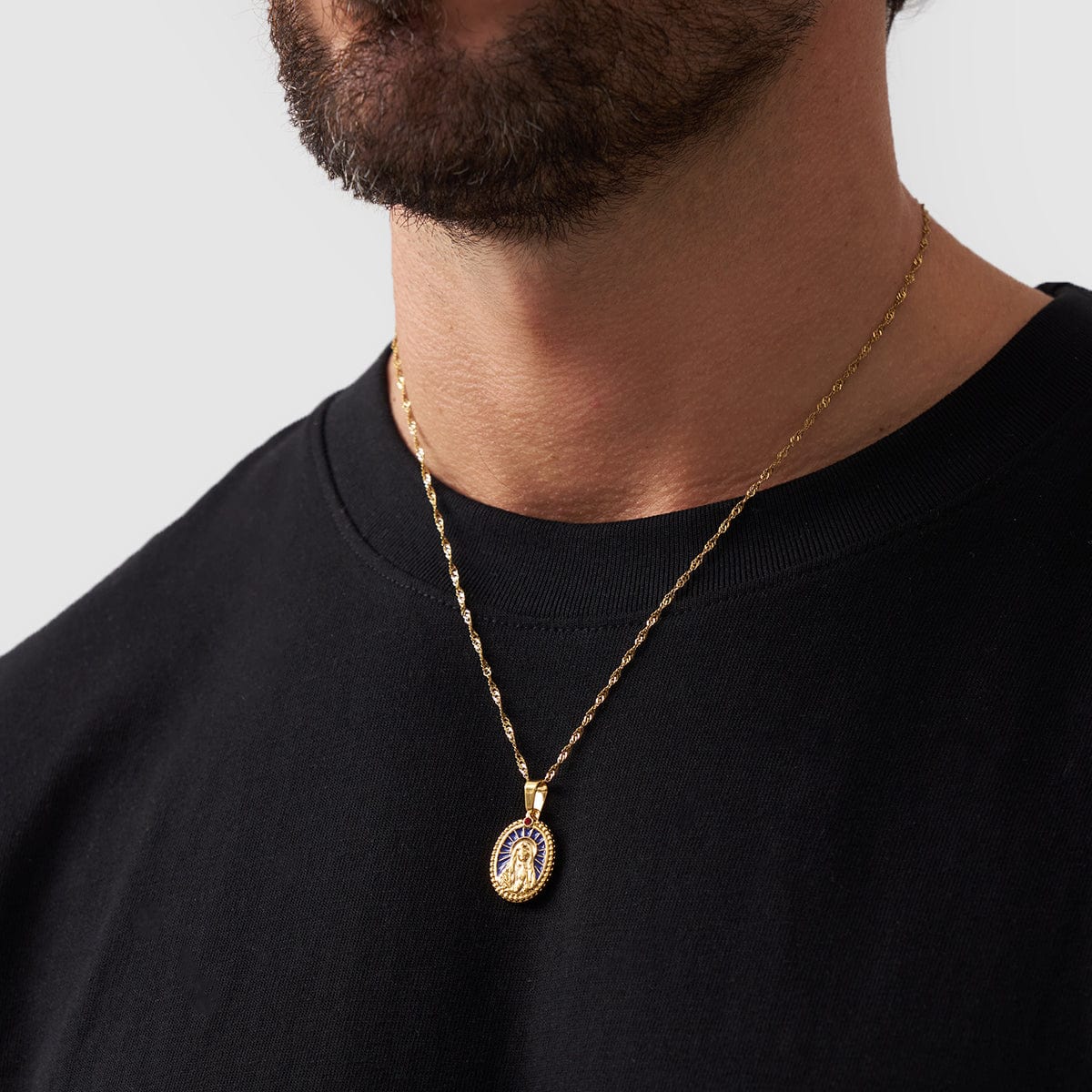 This 18K pendant features a detailed depiction of the Virgin Mary, set against a deep blue enamel backdrop. Rays of light surround her hands in prayer, symbolising the protection and blessing she bestows upon the wearer. Accented with a single red gemstone, it’s suspended from a premium golden bail and 2mm rope chain, finished with our signature scratch and fade resistant protection.