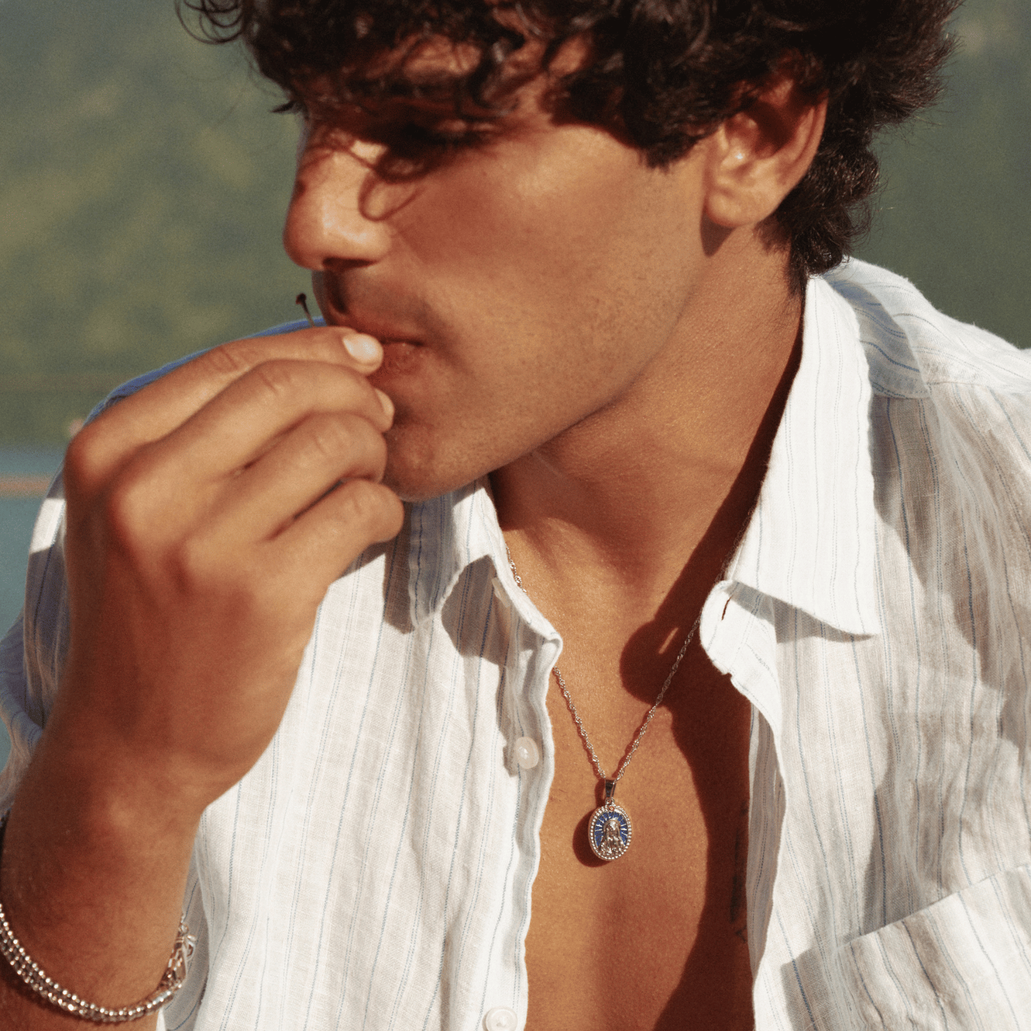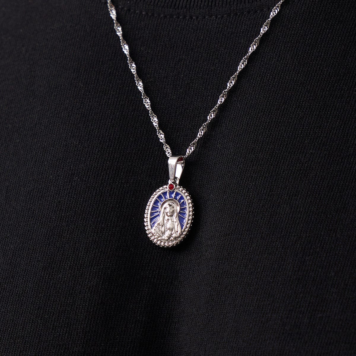 This silver pendant features a detailed depiction of the Virgin Mary, set against a deep blue enamel backdrop. Rays of light surround her hands in prayer, symbolising the protection and blessing she bestows upon the wearer. Accented with a single red gemstone, it’s suspended from a sturdy silver bail and 2mm rope chain, finished with our signature scratch and fade resistant protection.